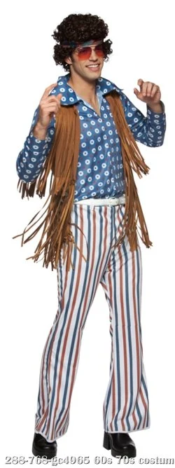Costume includes: Wild fringed vest tops striped pants and patterned shirt. The Groovy, Hippie Johnny Bravo!
