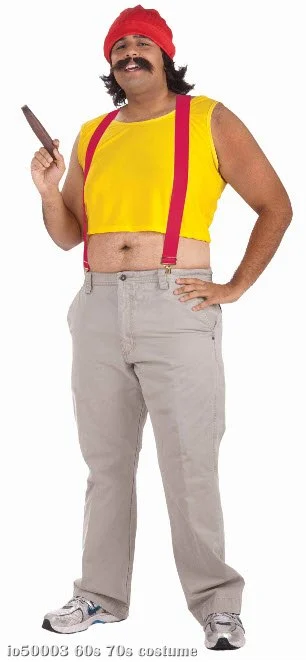 Costume includes: Yellow tank top tee, suspenders, wig, moustache and red cap.