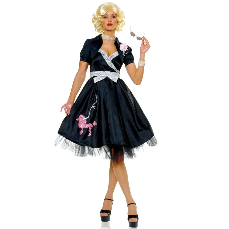 Your dance card will definitely be full this evening! Whether you are doing the foxtrot at your cotillion, or the Watusi during the local diner’s sock-hop, this elegant ensemble will take center stage! The Hop Diva costume includes: a black dress featuring back zipper closure, a poodle appliqué, tulle trimmed skirt, silver disco-dot trim, and an attached matching belt. A cropped jacket with a beaded corsage is also included to complete this fabulous fifties frock!