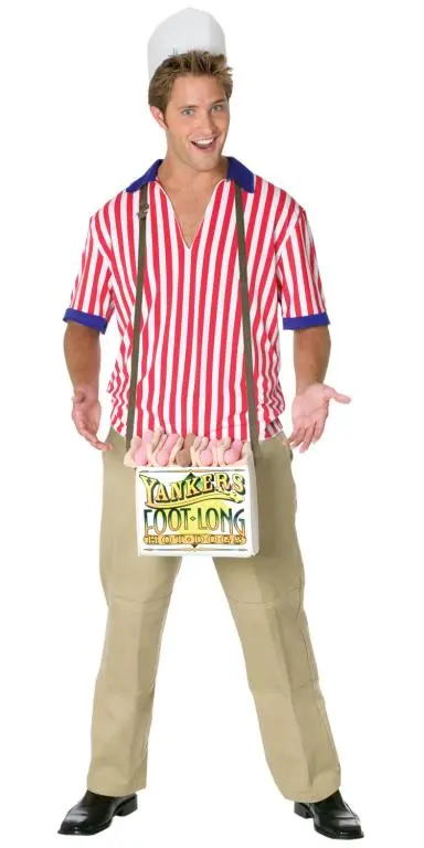 Hot Dogs Anyone?To be the guy that everyone loves, you will need this hot dog vendor costume.It includes a small size hot dog carrier with five hot dogs in buns, and graphic on front of box reading “Yankers Foot Long Hot Dogs”, with red and white striped shirt and white vendor hat.Available size: