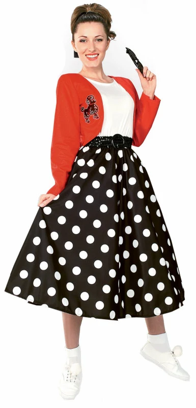 Let’s go to the hop – oh baby! The Polka Dot Rocker costume is perfect for dinners at the diner or Friday nights at the drive-in! It includes: A one-piece dress with a black and white polka-dot skirt, a white blouse with an attached sweater, and an attached belt.