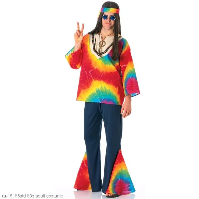 Step back in time to when love was free and peace was what you fought for. This is the Psychedelic Hippy Adult 60’s Costume features a tie-dyed headband, tie-dyed shirt and black bell-bottom pants with tie-dyed bell flares. Be completely far out when you pair this hippie costume with a long style 1960s wig (sold separately).