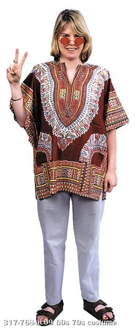 Peace And Happiness!Costume includes: Brightly colored, cotton blend, 60’s hippie style shirt with V-cut front. Splits up the side.Available size: