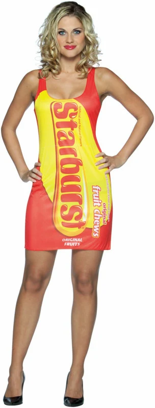 Unleash your stylish ways on unsuspecting party guests. A refreshing blast of fruity fun! Costume includes a tank-style dress made to look like a Starburst candy wrapper.